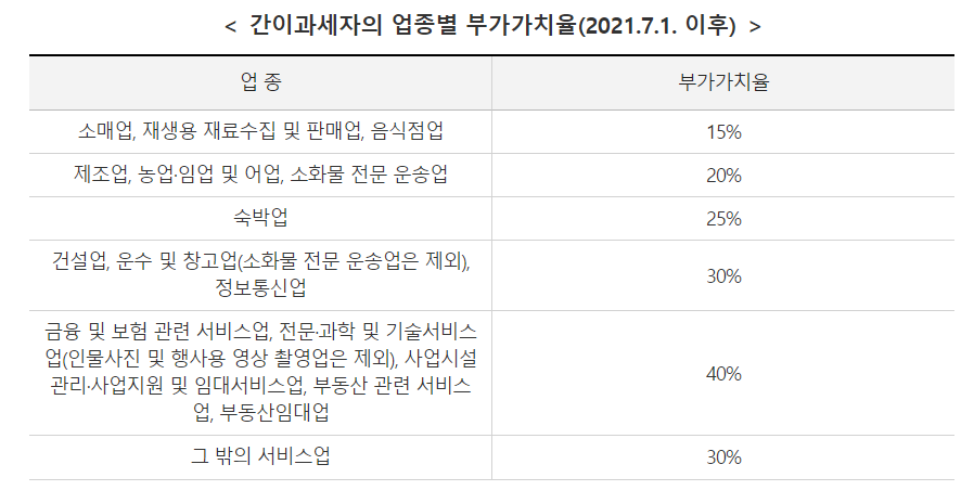 간이과세자의 경우 업종별로 부가가치율이 15%~40%까지 다르게 적용됩니다.