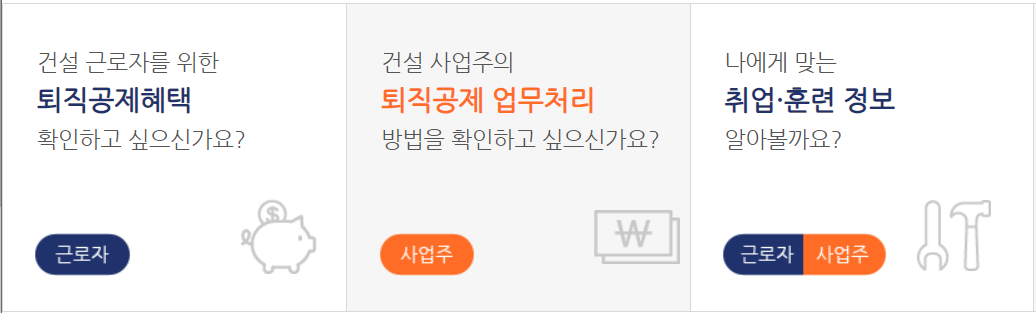 퇴직공제제도 가입공사현장에서 근무하는 근로자로 계약기간이 1년 미만의 일용직, 임시직 건설근로자가 적용대상입니다.