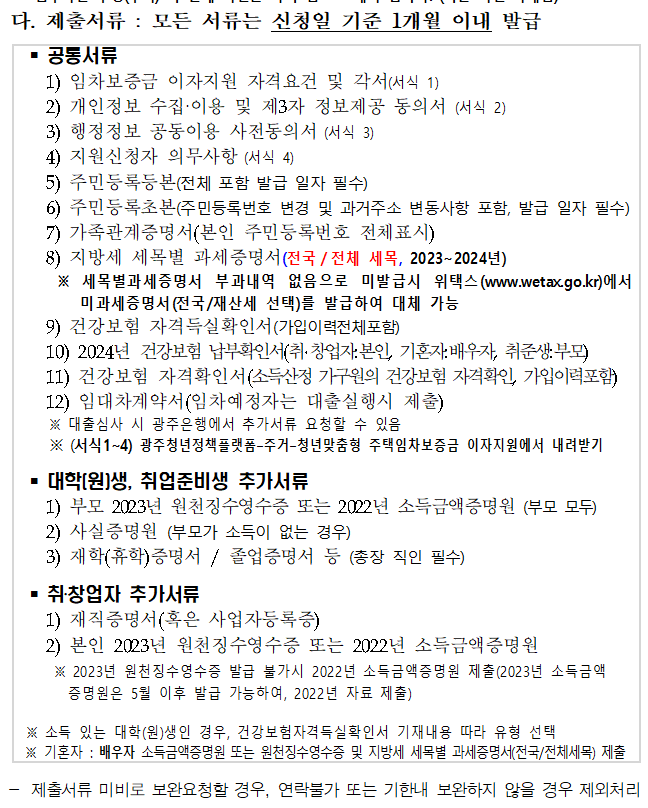 광주광역시 전월세 보증금 이자지원 사업의 신청과 서류 등에 대해 알아보았습니다. 자격 조건에 해당하는 청년분들이라면 신청하여서 이자를 지원받아 주거비를 줄이면 좋겠습니다.