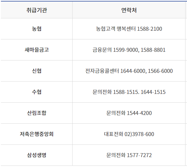 농협, 신협, 수협, 새마을금고, 산림조합, 저축은행, 삼성생명