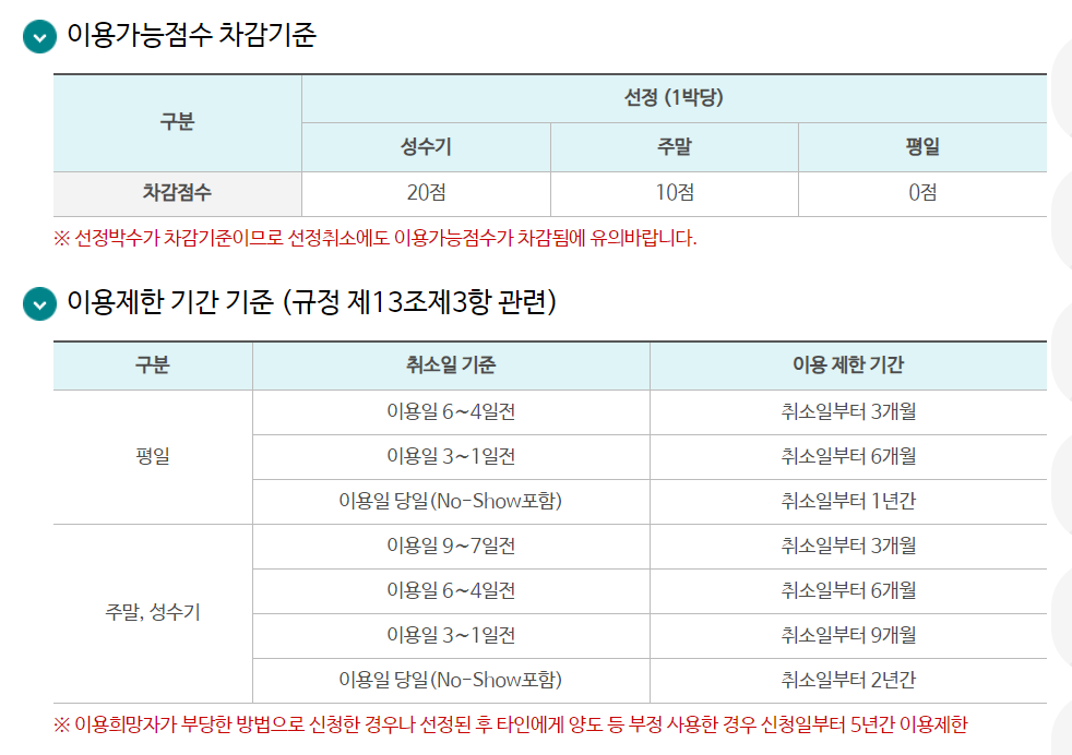 그밖에 이용가능점수 배점기준과 차감기준, 이용제한 기간 기준, 이용제한 기간 부과 예외는 아래의 이미지를 참고 바랍니다.
