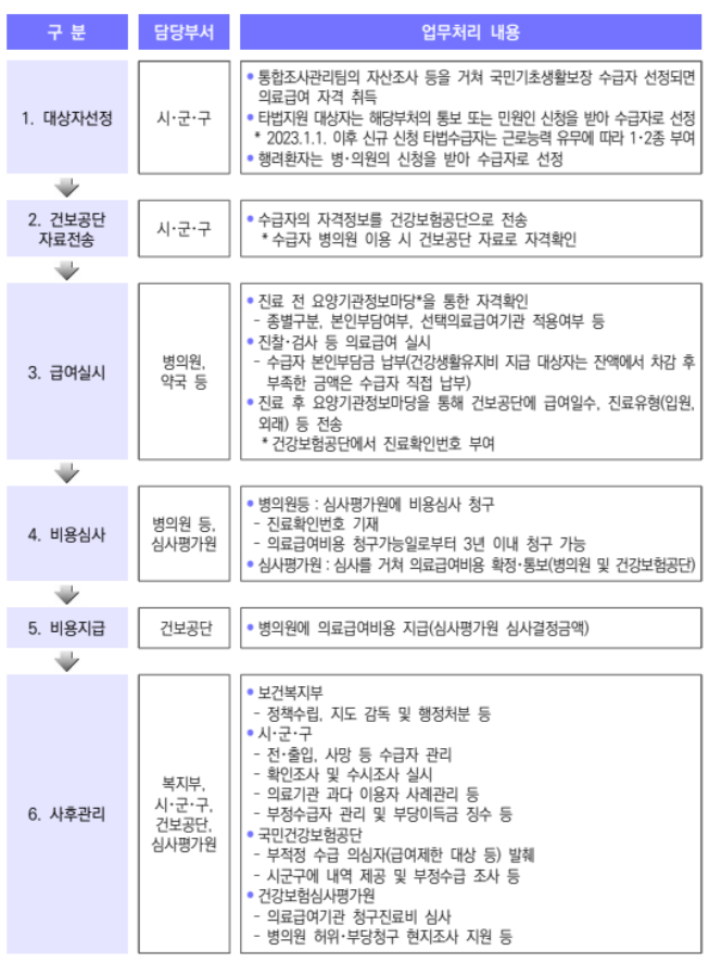 1. 대상자 선정 : 행정복지센터를 통해 기초생활수급자 신청해서 선정되면 의료급여 수급권자 자격을 취득합니다. 타법에 의한 대상자는 해당 부서의 통보나 신청을 통해 근로능력에 따라 1,2종이 구분되어 적용됩니다. 행려환자는 병원의 신청으로 수급자가 선정됩니다.