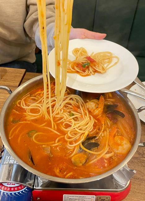 세 번째 메뉴는 해산물 토마토 국물 파스타입니다. 국물파스타이다 보니 거의 짬뽕처럼 보이기도 합니다. 안에 게도 들어가고 홍합, 새우, 오징어 등 해산물이 들어갑니다. 청양고추도 약간 들어가서 살짝 매콤합니다. 이거 해장하는데 좋을 것 같습니다. 토마토 파스타다 보니 뭔가 건강하게 해장할 수 있을 것 같은 맛이랄까요? 양도 많고 맛있게 먹었습니다.