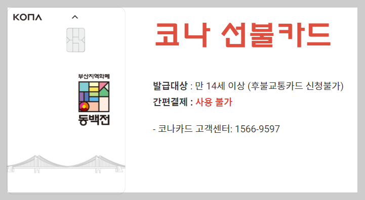 코나 선불카드는 간편결제 사용이 불가하고 만 14세 이상 발급받을 수 있으며 후불교통카드 신청이 불가합니다.