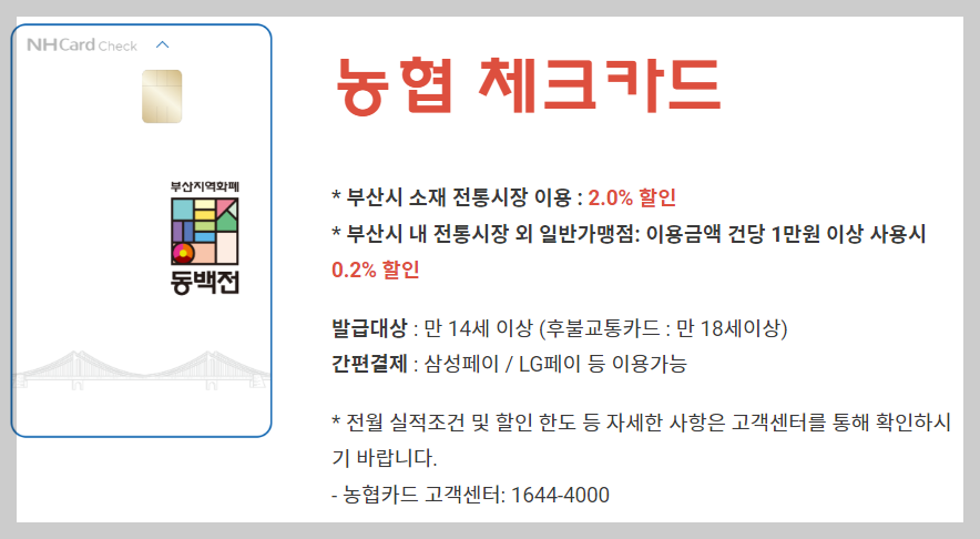 농협 체크카드는 부산 소재 전통시장 이용 시 2% 할인되며 일반가맹점에서는 1만 원 이상 사용 시 0.2% 할인됩니다.