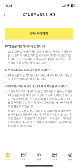 이상으로 KT알뜰폰 요금제로 밀리의 서재 무료구독서비스 적용방법에 대해 알아보았습니다.