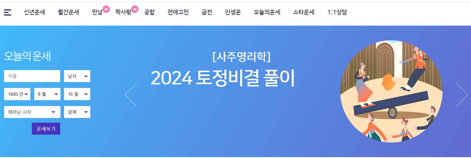 2024년 신년운세부터, 월별 운세, 재물운, 연애운, 궁합 등 다양한 운세 메뉴를 제공하고 있습니다.