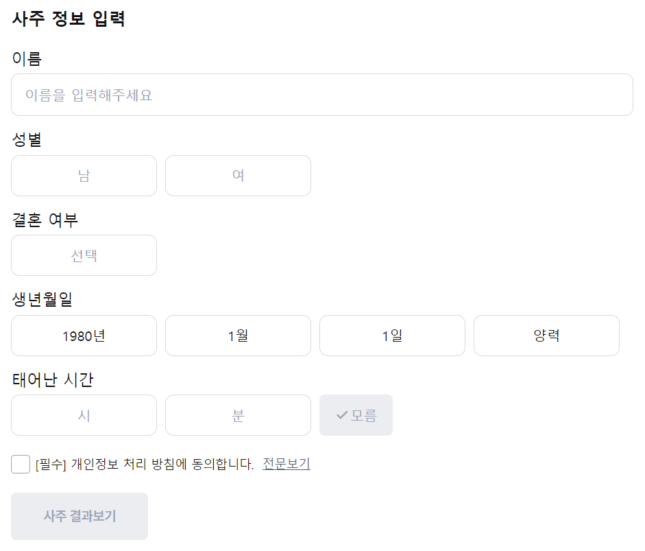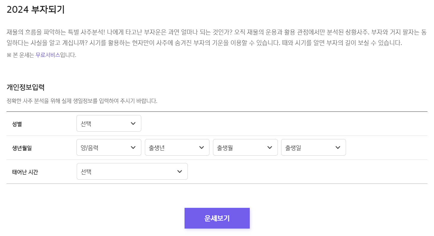 홈페이지에 접속하면 바로 메인화면에서 이름과 성별, 생년월일과 태어난 시각을 입력하고 운세 보기를 클릭하면 바로 2024년 사주명리학 풀이를 확인할 수 있습니다.