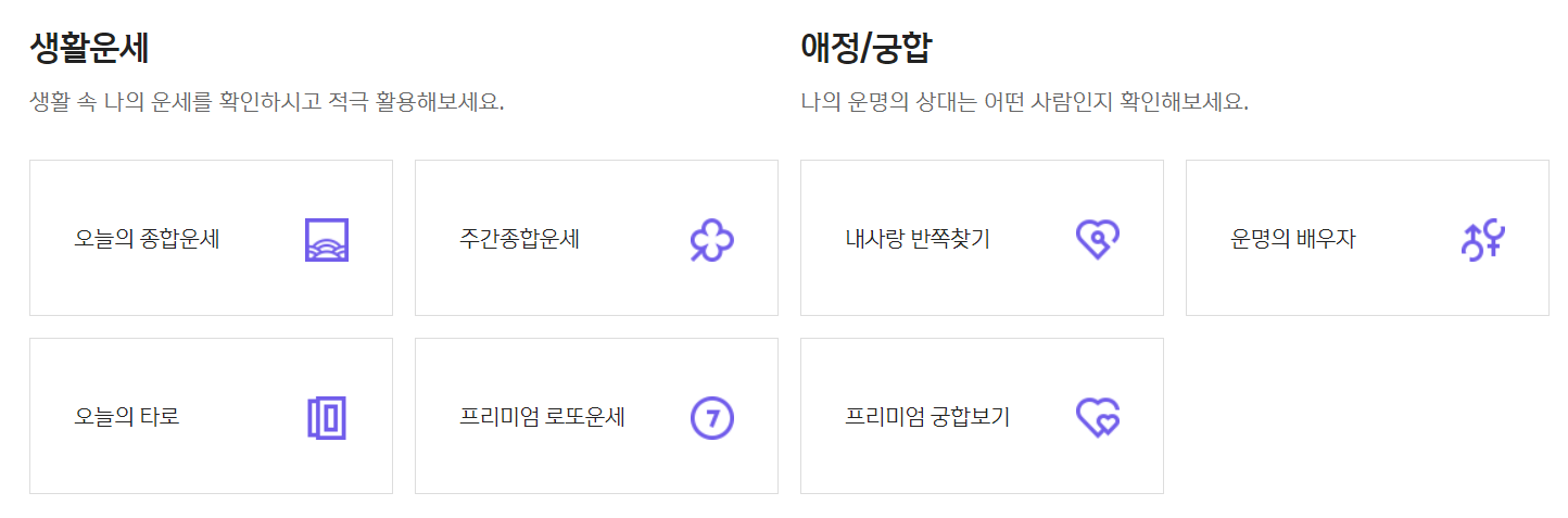 2024년 신년운세부터, 월별 운세, 재물운, 연애운, 궁합 등 다양한 운세 메뉴를 제공하고 있습니다.