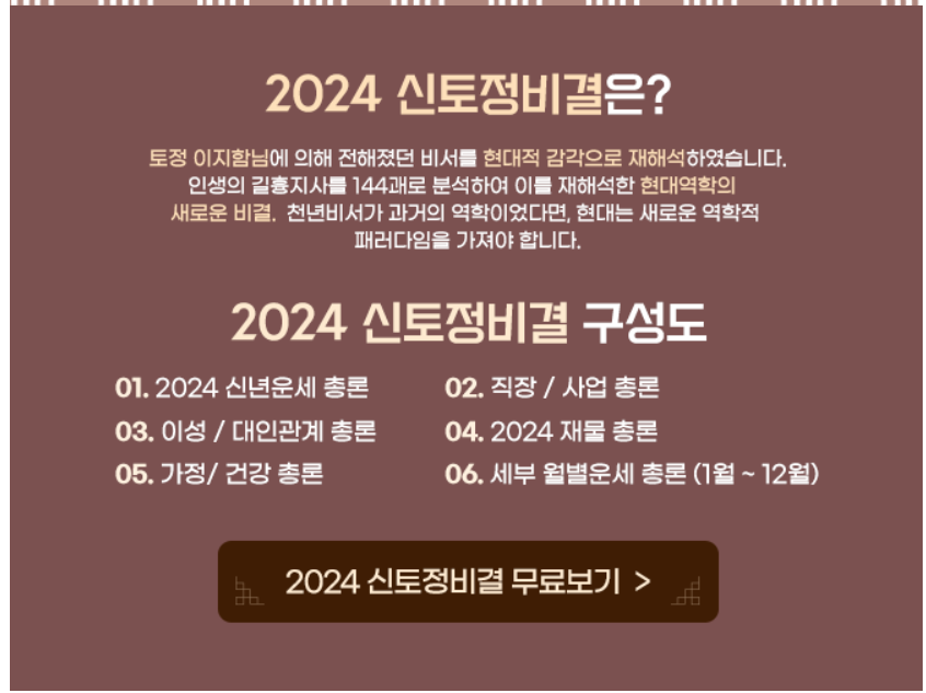 - 신년토정비결 : 한해의 길흉을 확인하고 이정표로 삼을 수 있습니다.