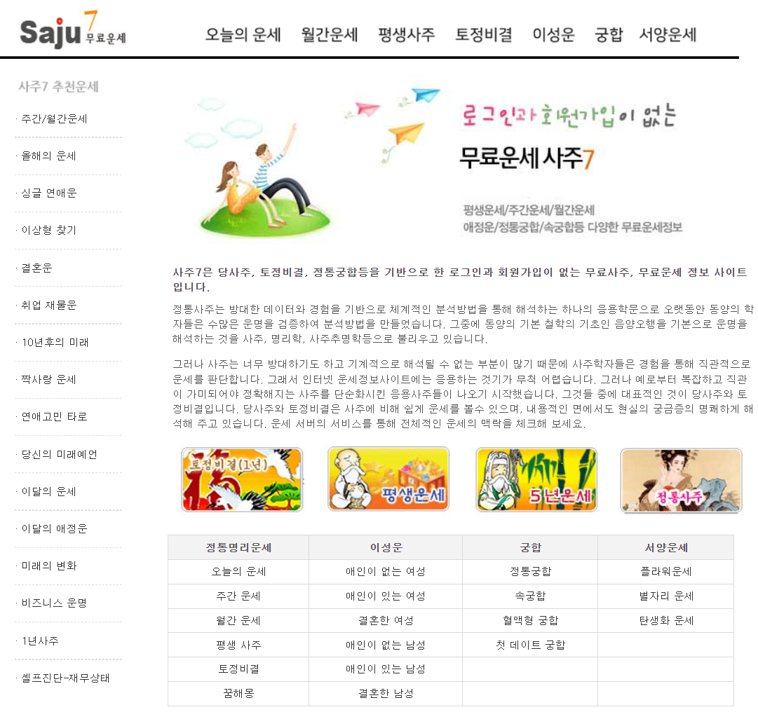 다음은 saju7 무료운세입니다. 사주 7의 경우도 로그인과 회원가입 없이 이용할 수 있습니다.
