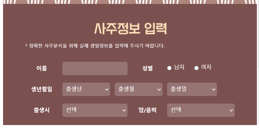 홈페이지에 접속하면 바로 메인화면에서 이름과 성별, 생년월일과 태어난 시각을 입력하고 운세 보기를 클릭하면 바로 2024년 사주명리학 풀이를 확인할 수 있습니다.