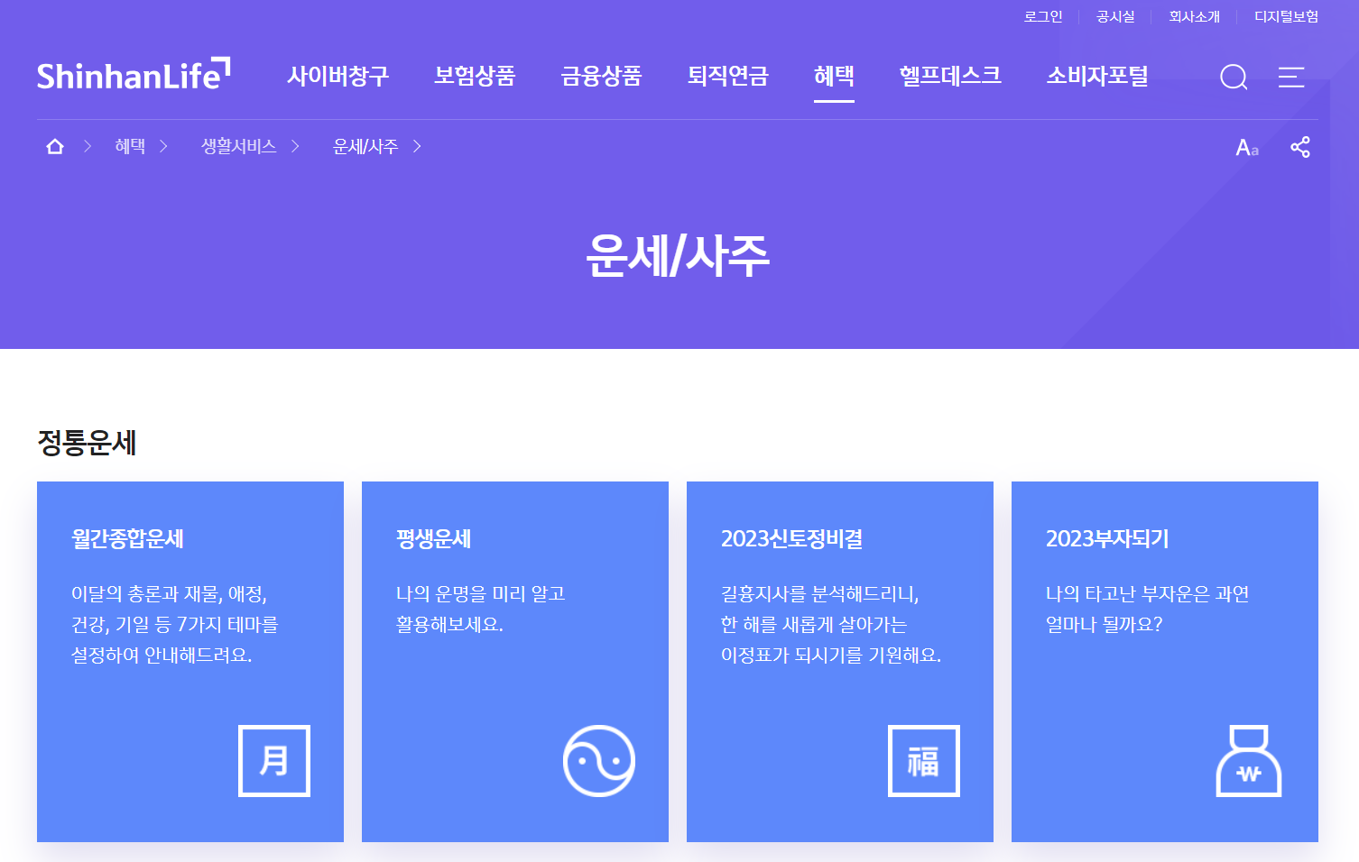 신한생명 홈페이지의 혜택 > 생활서비스 메뉴에 접속하면 운세 / 사주라는 메뉴가 있습니다.