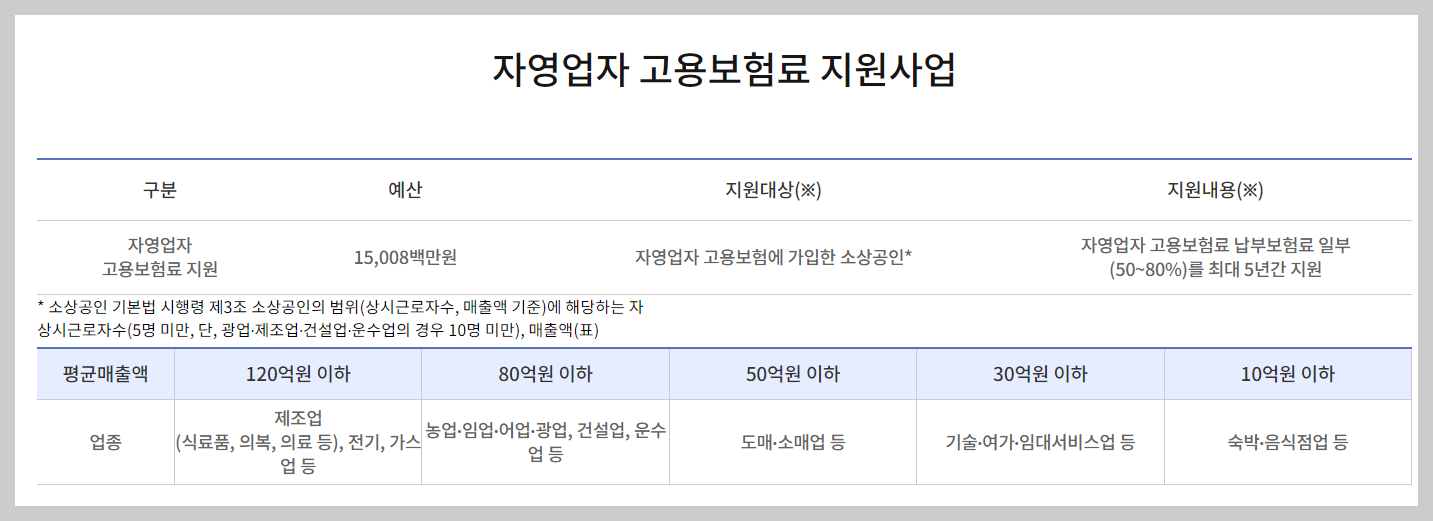 사업을 하는 소상공인, 자영업자들이 소득이 많으면 부담이 되지 않을 수 있지만 소득이 적을 때에는 고용보험료를 납부하는 것이 부담이 될 수 있습니다. 그렇기에 중소기업벤처부에서는 이러한 자영업자들의 부담을 줄여주기 위해 고용보험료 지원 사업을 시행하고 있습니다.