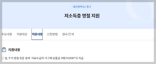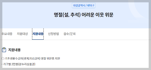지원금액 : 세대별 연 20만 원, 설, 추석 각 10만 원