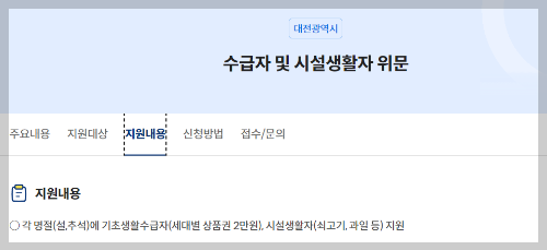 지원금액 : 기초 수급자 세대 상품권 2만 원 / 시설생활자 쇠고기, 과일 등 지원