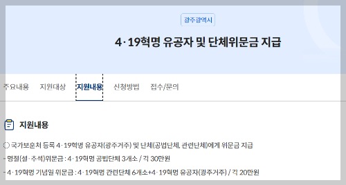 지원금액 : 명절 4.19 혁명 공법단체 3개 각 30만 원 / 단체 6곳과 유공자 4.19 기념일에 20만 원