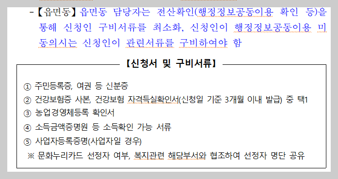 농업 이외의 종합소득이 3,700만 원을 초과한다면 지원받을 수 없으며, 건강보험 직장가입자와 사업자등록자는 선정제외 됩니다. 직장가입자더라도 농업 외 소득이 1,000만 원 이하라면 지원가능하며 소득금액증명원을 첨부해야 합니다. 문화누리바우처 카드 선정자는 선정 제외됩니다.