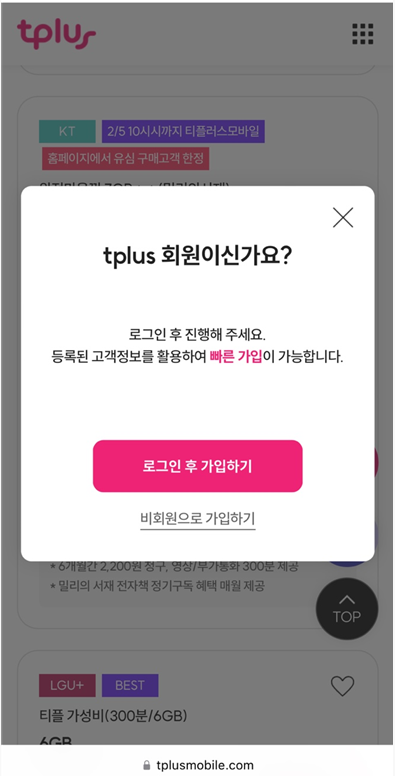 티플러스 홈페이지로 접속됩니다. 접속된 홈페이지에서 본인이 신청하고 싶은 요금제를 찾아 가입하기를 클릭합니다.