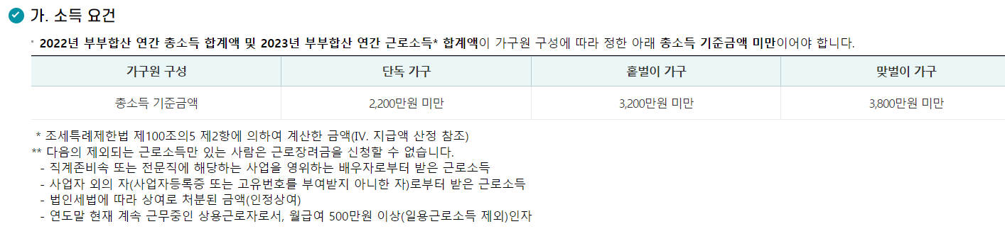 2022년 부부합산 연 총득과 2023년 부부합산 연 근로소득이 가구구성원의 기준금액 미만이어야 합니다.