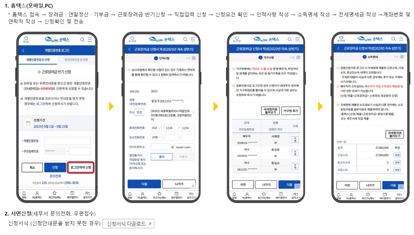 위 방법으로 직접 신청이 어렵다면 장려금 상담센터나 세무서를 통해 신청대리 서비스를 요청할 수 있습니다.