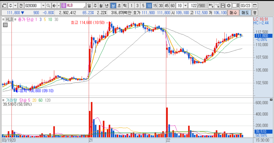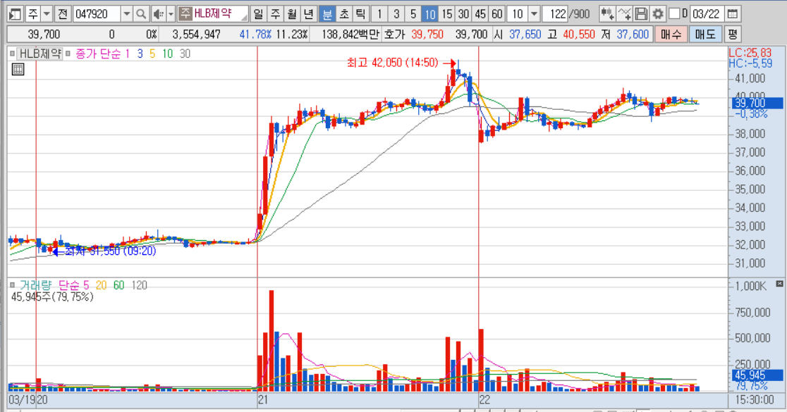 3월 21일에 HLB 간암 신약 승인 예정으로 주가가 급등했습니다. HLB뿐 아니라 다른 바이오주들도 좋은 흐름을 보여줬던 날입니다. 5월에 간암 신약 승인에 대한 기대감에 주가가 오르고 있었습니다.
