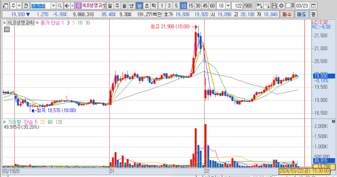 HLB생명과학이 3월 21일에 1500억 유상증자를 발표했습니다. 3월 21일에 HLB관련주가 대부분 급등했었는데요. 장 마감 후 유상증자 발표소식이 들리면서 시간 외 매매 때 주가가 떨어지기 시작했습니다. 유상증자 발표가 악재로 작용했는지 22일 주가를 살펴보겠습니다.
